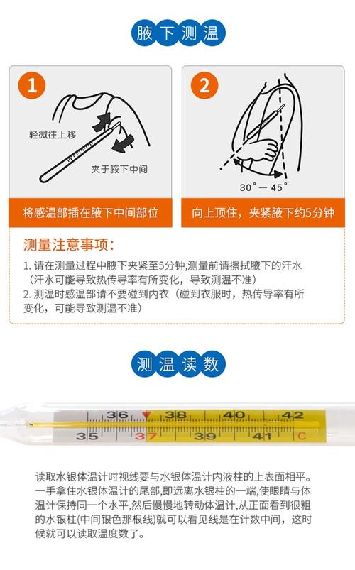 用酒精棉球擦拭温度计水银泡及刻度部分,避免交叉感染。消毒后静置1『2』分钟,待酒精挥发后再使用。测量方法 根据测量部位不同,水银温度计的使用方法略有差异,常见测量部位包括腋下、口腔和直肠。 腋下测量(最常用)步骤:将温度计水银泡端夹紧于腋窝深处,手臂紧贴身体,避免温度计滑落。