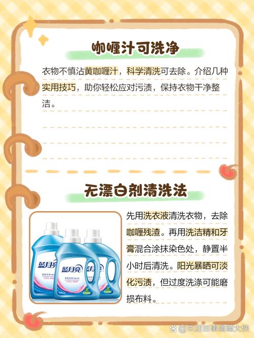 由于咖喱汁含有油分,使用洗洁精清洗也是有效的。将洗洁精涂抹在污渍处,然后用手揉搓清洗。使用汽油:轻轻将汽油涂抹在咖喱汁处。用手轻轻搓洗,即可将咖喱汁清洗干净。但需注意,使用汽油时要小心,避免引发火灾。使用漂白剂:如果其他方法清洗不掉,可以考虑使用漂白剂。