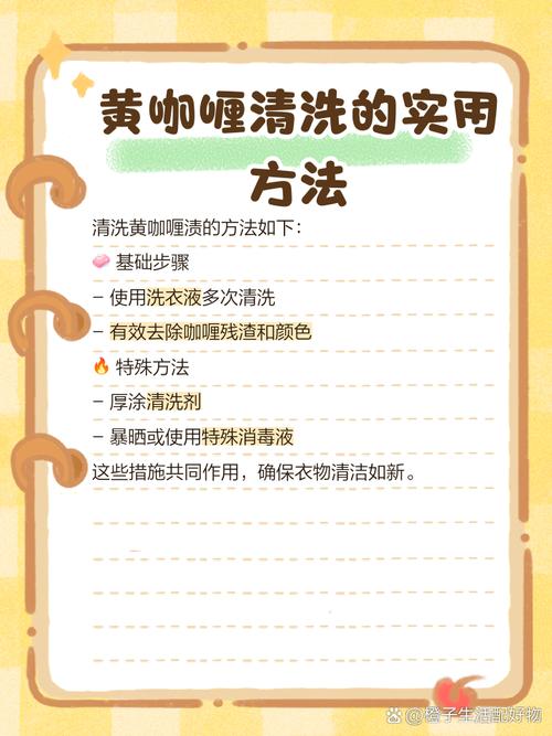 咖喱黄的污渍难以洗掉的主要原因是咖喱中含有一些难以分解的油性物质。针对不同材质的污渍,可以采取以下方法进行清洗:对于一般衣物:可以使用温热的甘油进行处理。先将衣物上的咖喱污渍弄湿,然后用50度的温热甘油洗涤,即可轻松洗去咖喱油渍。对于棉麻衣物:可以使用10%的氨水进行洗涤。