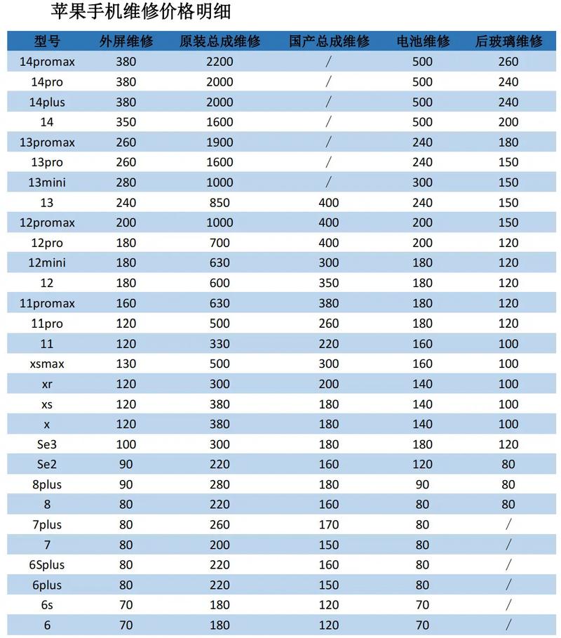 苹果手机维修费用价目表