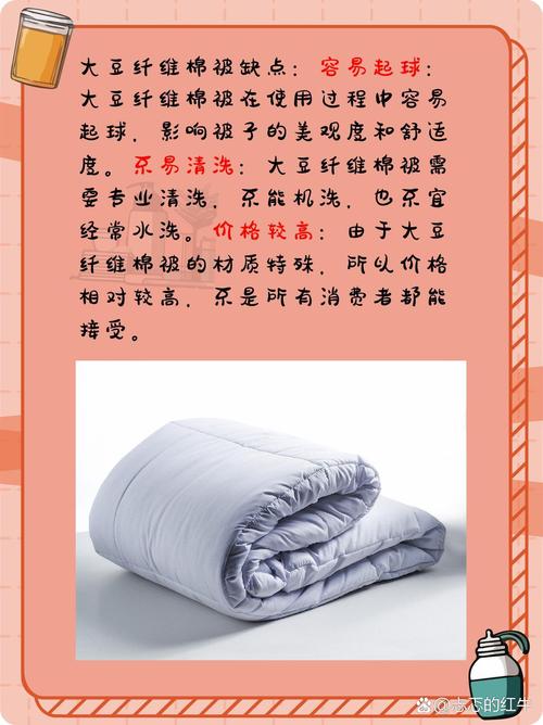 〖One〗、大豆纤维被子的缺点: 费用较高:相比于普通棉被或其他合成纤维被子,大豆纤维被子通常费用较高。 容易产生静电:由于大豆纤维的静电特性,容易吸附细尘,需要定期清洁。 容易起球:由于大豆纤维的特性,长时间使用后可能会产生起球现象,影响外观。