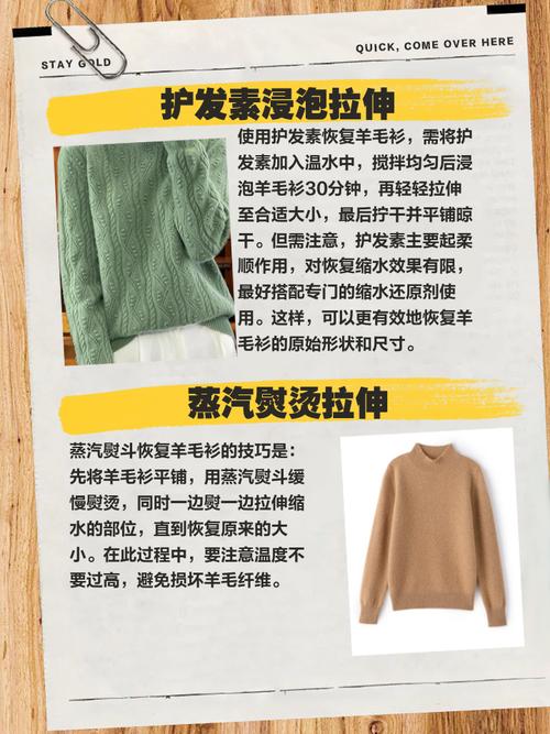 蒸汽拉伸法 羊绒衫缩水后,可使用蒸汽熨斗加热缩水部分,然后缓慢拉伸并平铺在毛巾上,让其自然风干。这样可部分恢复羊绒衫的原状。厚纸板定性法 对于严重的缩水情况,可以使用硬纸板剪裁成羊绒衫的形状,套在衣服上并用夹子固定。结合蒸汽熨斗使用,有助于衣服恢复原形。