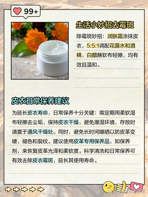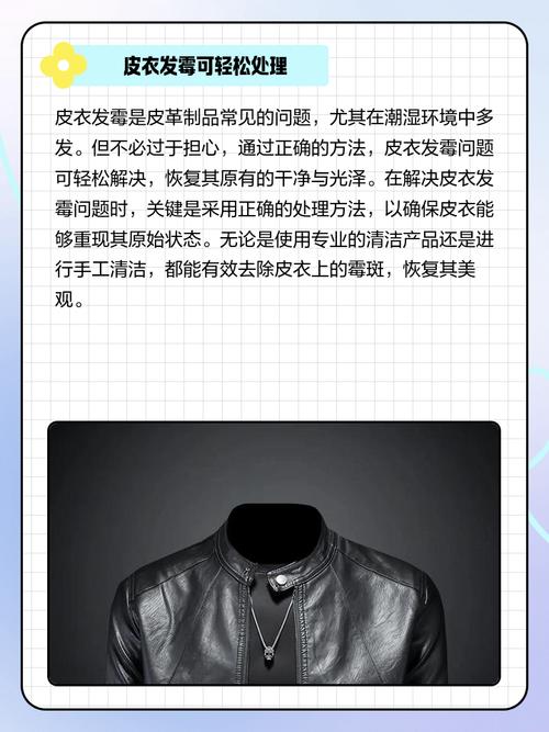 皮衣发霉有霉斑的处理妙招如下:基础清洁与保养 擦拭霉斑:首先,使用软毛刷或干净的布,轻轻擦拭皮衣表面的霉斑,以去除表面的霉菌和污垢。注意动作要轻柔,避免损伤皮衣表面。