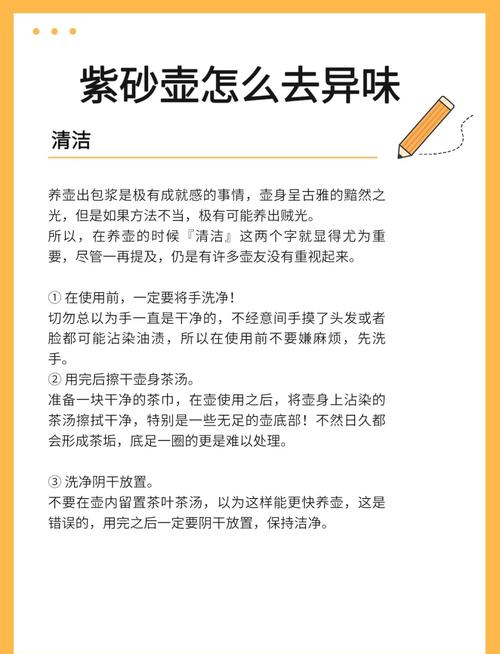 〖One〗、除去紫砂壶中霉味的方法有以下几种:冷热交替法:操作过程:往紫砂壶内注入开水,待壶体热透后迅速倒出,并立即注入冷水。如此反复几次,可以有效去除霉味。原理:紫砂泥具有透气性和收缩性,在冷热交替的作用下,壶身的毛孔会收缩与张开,有助于排出内部的霉味和湿气。