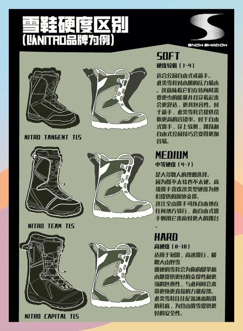 鞋硬度不是指鞋底部的硬度,而是指鞋舌部分的硬度,雪鞋硬度分为1『1』0级。新手建议:中偏软(3『5』)自由式平花选手建议:软(1『4』)滑行刻滑选手建议:硬(7『1』0)都想玩一点全能式选手建议:中偏硬(5『7』)玩跳台的也建议不能太软,中偏硬根据自己需求而定。