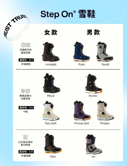 包装盒、鞋内标签上。如果是自己买的单板鞋,那么在包装盒上会有包裹性、硬度、支撑性三个重要参数,然后还可以看到材质等信息。硬度是指滑雪鞋材质的坚硬程度,最开始是用114这样的数字表示,现以改成使用50、70、80、90、120等等数字表示,数字越大硬度就会越高,穿在渍上好子就会越硬,是滑雪鞋和宽度、内胆、行走模式等—样都很重要的参数。