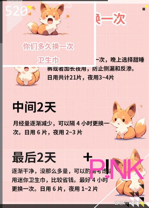 经量多时:建议每隔34小时,甚至1两小时更换一次,以避免细菌滋生和保持外阴部的清洁干燥。经量少时:可以使用护垫,但同样需要注意更换频率,尽量保持外阴部的清洁。如有不适感:如感到外阴部潮湿、瘙痒或不适,应随时更换卫生巾,并适当缩短更换时间。
