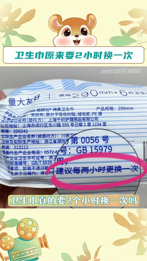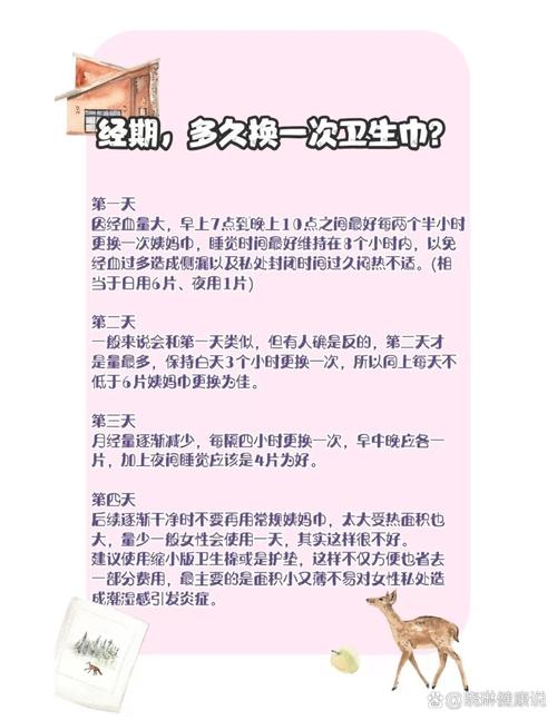〖Two〗、大姨妈期间,建议每2到4个小时换一次卫生巾。更换频率:为了保持私处的清洁和干燥,避免细菌滋生,建议女性在月经期间每2到4个小时更换一次卫生巾。这个频率可以根据月经量的多少进行适当调整。如果月经量较大,可能需要更频繁地更换卫生巾。