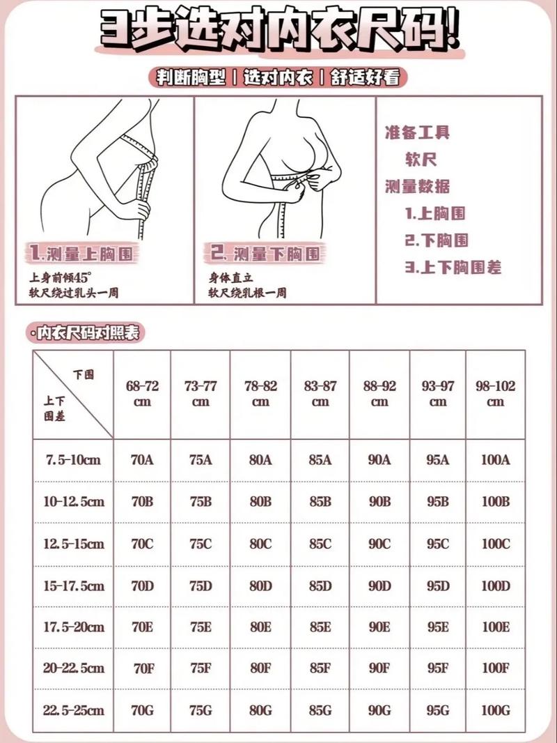 〖Four〗、75C和80C的文胸尺寸差异主要体现在罩杯的容量上。 75C的上胸围对应大约90cm,而80C的上胸围对应大约95cm。 文胸尺码对照表是按照世界标准制定的,用于确定合适的文胸尺寸。 测量胸部下围时,需要用软皮尺水平围绕乳房底部一周,单位为cm。