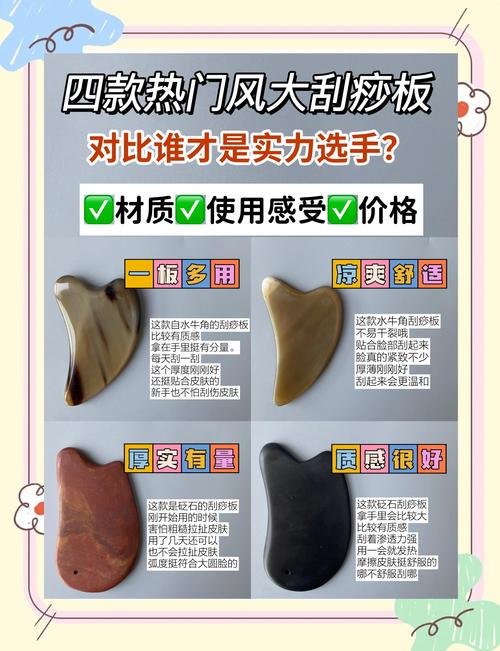 〖Three〗、牛角刮痧板、砭石刮痧板、蜜蜡刮痧板和玉石刮痧板都是较为常见的优质刮痧板材质,具体选取哪种材质好,需根据个人需求和预算来决定:牛角刮痧板:优点:材料天然,如水牛角、黄牛角等,费用亲民,实用性强,且具有一定的收藏价值。适用人群:适合大众使用,特别是预算有限且追求实用性的消费者。
