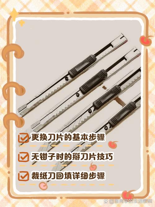 〖Three〗、美工刀换刀片的方法如下:准备工具 新刀片:确保新刀片与美工刀型号相匹配,避免过大或过小导致无法安装或使用不便。手套(可选):为了保护手部安全,建议在更换刀片时佩戴手套。拆卸旧刀片 锁定刀片:首先,确保美工刀的刀片锁定装置处于锁定状态,以防止在拆卸过程中刀片突然弹出伤人。