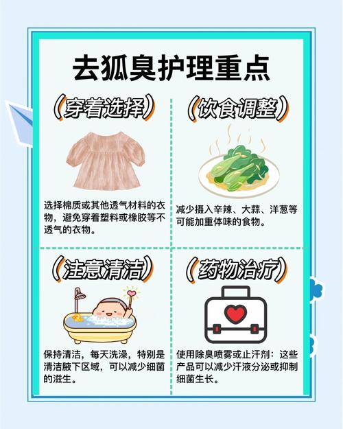 〖Four〗、要有效预防狐臭,可以保持良好的个人卫生习惯,如勤洗澡、勤换衣物,特别是运动后及时清洁腋下等易出汗的部位。此外,选取透气性好的衣物,避免长时间穿着紧身或不透气的衣物,也有助于减少汗液的滞留和细菌的滋生。如果狐臭问题严重,可以寻求专业医生的帮助,考虑使用止汗剂、抗菌剂或进行其他适当的治疗。