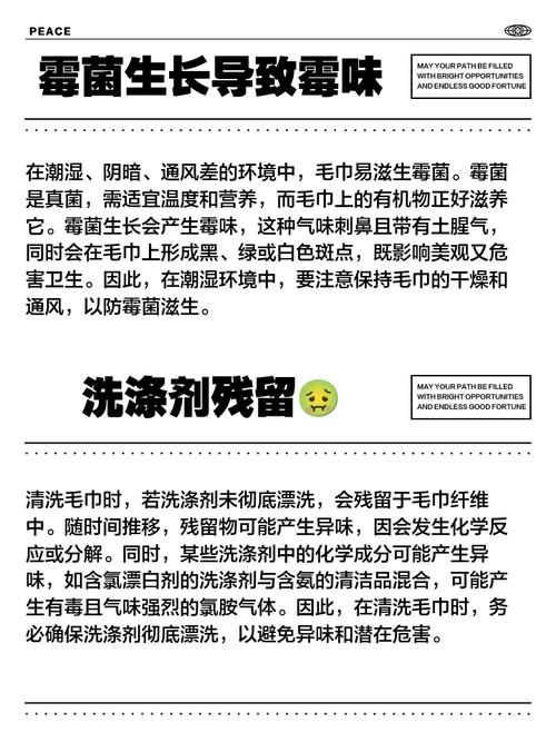 〖One〗、一是环境因素。如果将毛巾放置在潮湿、通风不良的地方,比如卫生间角落,空气难以流通,水分不易散发,就会为细菌滋生创造条件,细菌大量繁殖后会产生馊味。二是使用习惯问题。很多人使用毛巾后没有及时清洗,人体分泌的汗液、油脂、皮屑等附着在毛巾上,时间一长就会变质发臭。