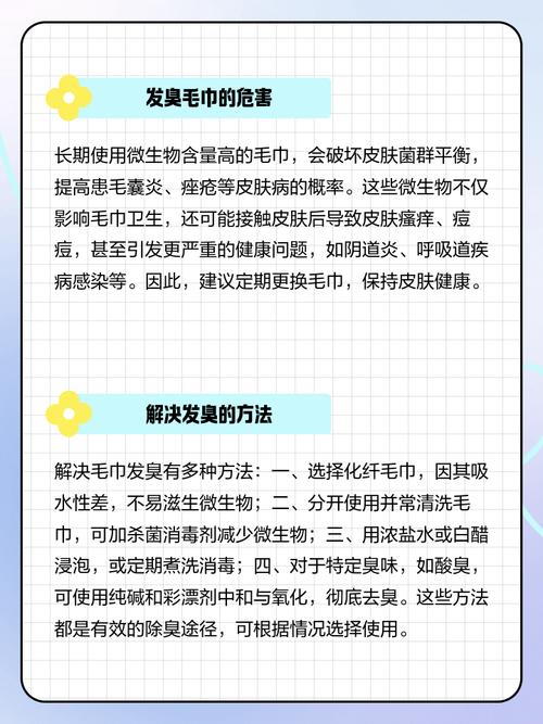 男性毛巾发臭可能预示着一些健康或生活习惯方面的问题,需要从以下几方面警惕。个人卫生习惯如果男性自身不爱清洁,出汗多却不及时洗澡换衣,皮肤污垢油脂附着在毛巾上易滋生细菌致发臭,应注意保持身体清洁。
