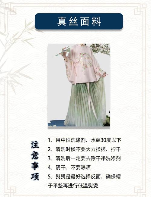 丝绸布料汉服:丝绸布料较为易碎,清洗时应轻轻拧水,建议用手清洗。若太脏或清洗不便,同样可送干洗店干洗。