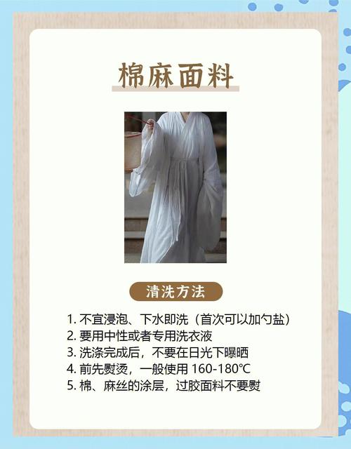 棉质汉服 首次清洗:棉质汉服第一次洗可能会缩水,建议清洗前在水中浸泡几分钟,但时间不宜过长,以免损坏颜色。 清洗方式:可手洗或机洗,若衣物过脏或清洗不便,可选取干洗。 大麻纤维织物汉服 洗涤次数:大麻纤维织物刚性强,持力差,洗涤次数应少于棉织物。 清洗方式:避免使用硬毛刷和过度摩擦,以免织物表面起毛。