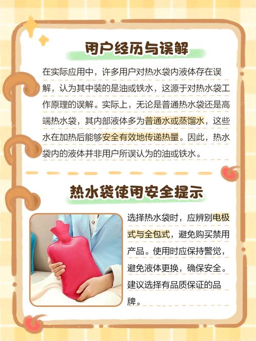热水袋里的水通常是特制的加热液体,并非普通的自来水。以下是关于热水袋里水的详细解 成分特性:热水袋中的水通常是经过特殊处理的加热液体,这种液体具有不易冻结、沸点较高且热容量大的特性,以便在加热后能长时间保持温度。