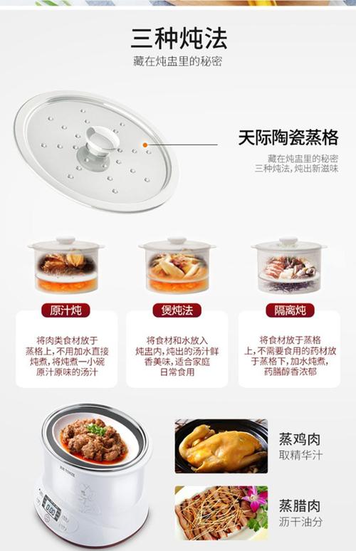 〖One〗、首先,电炖锅需要彻底清洗,确保没有残留的灰尘和杂物。用清水冲洗干净后,再用干净的布擦拭干。切记不要使用任何清洁剂,以免损害锅体。下面,根据说明书的要求,向电炖锅内加入适量的清水。注意不要加过多的水,以免影响烹饪效果。然后,将电炖锅放在炉子上加热。