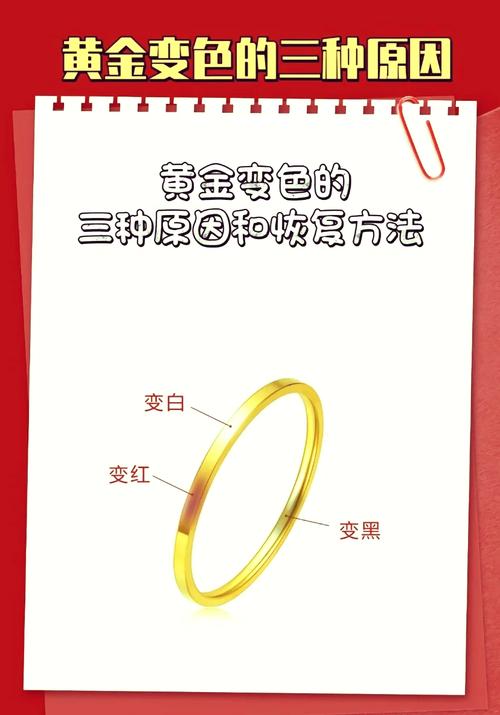 药物、杀菌剂、沐浴露、香水、发胶等。黄金戒指变白后不会自行恢复,但可以通过专业的高温加热处理来恢复其原始状态。这种处理需要在专业的珠宝修复处或购买首饰的地方进行,不建议自行操作。此外,为了避免黄金戒指变色,应注意避免其接触到碱性和酸性物质、含化学成分的日常用品以及一些贵金属制品。