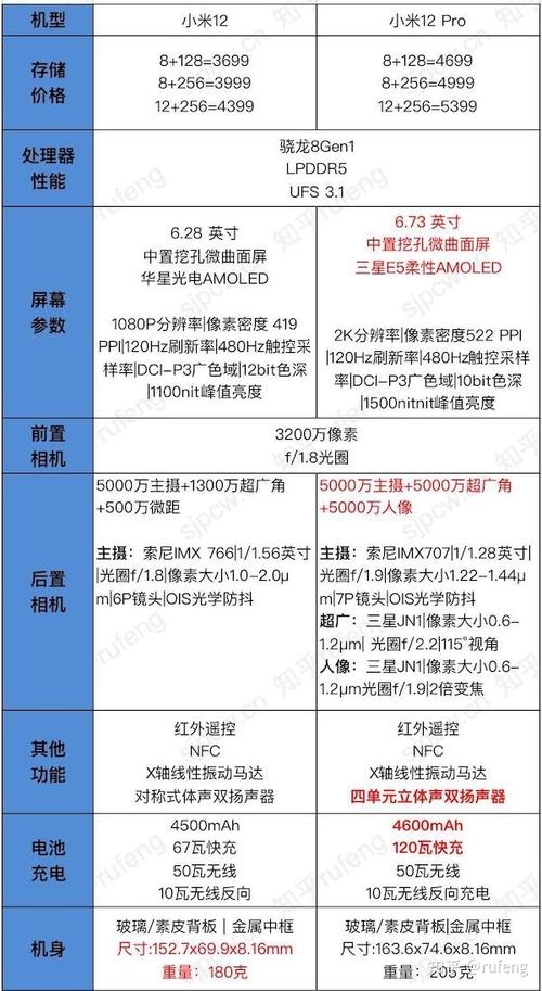 小米12和小米12pro参数对比
