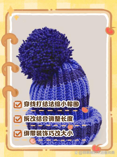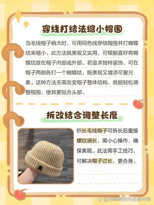 缩针法:如果熟悉编织技术,可以选取拆掉帽子的一部分或几圈的针,重新以更紧密的针脚编织,这样可以有效减少帽围。这种方法需要一定的编织技巧,但可以保持帽子的整体外观和风格一致。弹性带添加法:在帽子内部添加一条弹性带,通过缝纫的方式固定,可以使帽子更贴合头部。