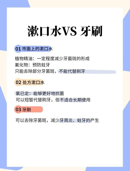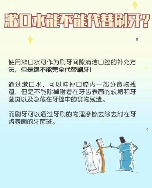 〖Two〗、每天仅使用漱口水后不能代替刷牙,以后也不可以一直这样做。具体原因如下:漱口水无法替代刷牙:漱口水主要是刷牙的辅助手段,它可以清洁牙刷难以触及的口腔区域,帮助减少口腔中的细菌,但无法有效去除牙齿表面的食物残渣和牙垢。刷牙通过物理摩擦可以更有效地清除这些污垢,保持牙齿和牙龈的健康。