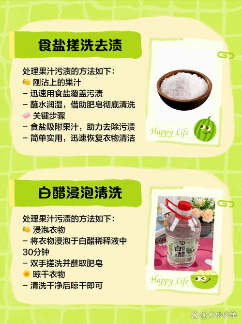 〖One〗、针对不同情况可采用以下方法: 基础处理(适合刚沾染30分钟内) 立即用食盐覆盖渍迹吸附果汁,搓揉至盐变褐色后冷水冲洗。若仍有残留,白醋兑水(1:2)浸泡10分钟分解果酸。