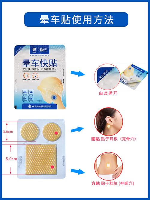 〖Three〗、晕车贴的使用方法为将胶面贴于双耳根后无头发的部位,每侧各一片,每次旅行前半小时贴上,可持续3天有效。适用人群广泛,但皮肤敏感者、皮肤破损者、老年人、孕妇、六岁以下儿童以及青光眼患者应避免使用。使用方法: 贴敷位置:将晕车贴的胶面贴于双耳根后无头发的部位。 贴敷数量:每侧各贴一片。