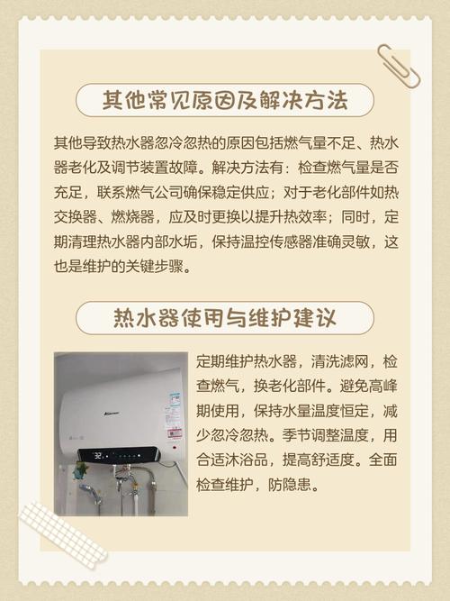 〖Two〗、总结来说,通过检查水压、调整热水器位置、确保减压阀正常工作、合理调节水量、选购合适容量的热水器,以及及时更换老旧设备,可以有效解决热水器忽冷忽热的问题,提升使用体验。