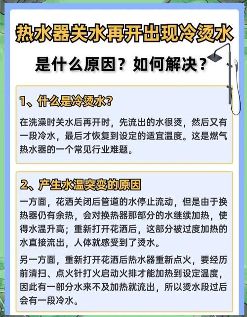 〖Two〗、热水器一冷一热的问题,可以通过以下几种方法来解决:调整水压:检查并调整水压:热水器忽冷忽热,可能是水压不稳导致。可联系物业管理处调整水压。确认是否水压问题:如果淋浴水量没有明显减小,可能并非水压问题。