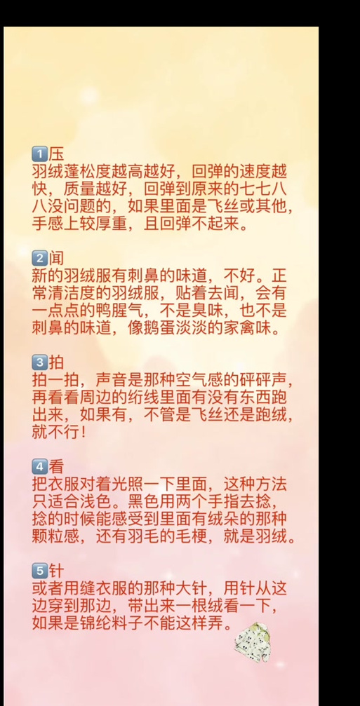 〖Six〗、含绒量分级:吊牌标90/10(绒/毛)优于80/20,女装轻薄款建议95%白鹅绒 防钻绒工艺:德国防绒针+每3cm13针的缝线密度,可防止加拿大雁羽绒外钻鹅绒相比鸭绒绒朵更大,同等保暖下重量轻15%。要注意清洁保养,每年干洗不超过2次,避免暴晒,收纳时不要压真空袋,保持羽绒天然蓬松结构。