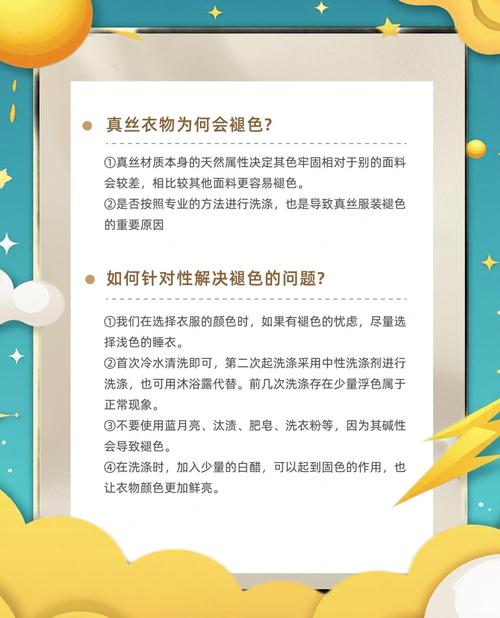 〖One〗、真丝衣物洗掉色后,首选的补救措施是寻求专业干洗店的帮助。干洗店拥有专业的染色技术和设备,能够针对真丝衣物的材质和掉色情况进行个性化的修复处理。他们可能会采用专业的染色剂,结合适当的温度和压力,尝试恢复衣物的原有色泽。自行染色尝试 若条件有限或出于成本考虑,也可尝试自行购买与衣物原色相近的丝绸专用染色剂进行染色。