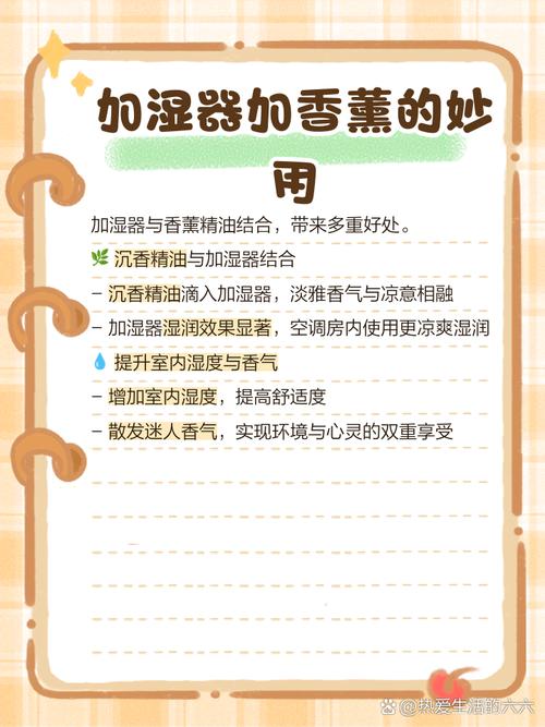 〖Four〗、加湿器里可以加入一些精油来增加室内空气的湿度和香味,如薰衣草精油、迷迭香精油、薄荷精油和茶树精油等。解释:精油的选取 在加湿器中加入精油,不仅可以提高室内空气的湿度,还能带来宜人的香气。选取合适的精油非常重要。薰衣草精油具有舒缓神经、助眠的作用,适合卧室使用。