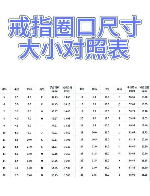 戒指尺寸表:不同国家的戒指尺寸对照表通常以戒指的内圈周长或直径来表示,不同国家的尺寸标准存在差异。 手指周长测量:为了找到合适的戒指号,需要先测量手指的周长。无论国内外的戒指尺寸标准,这一步骤都是必要的。 戒指号范围:以中国为例,戒指尺寸范围从4号到24号。