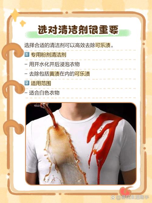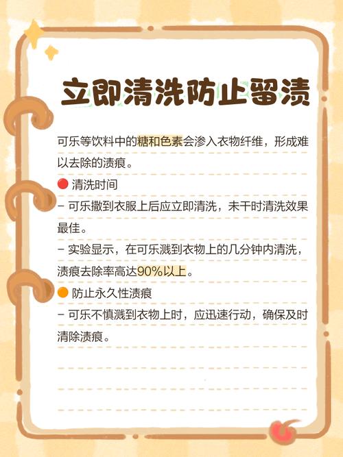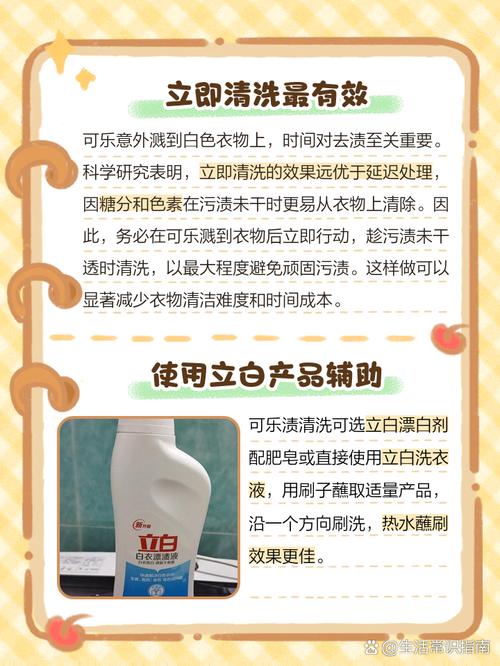 〖One〗、可乐弄到白衣服上,可以采取以下几种方法清洗:及时使用洗衣粉清洗 可乐含有大量色素和糖分,弄到衣服上后应尽快处理。可直接将洗衣粉涂抹在污渍处,放置约5分钟,让洗衣粉充分渗透并分解污渍。之后倒入少许水,反复擦洗污渍,直至污渍完全去除。这种方法能有效去除可乐中的色素和糖分,避免留下痕迹。