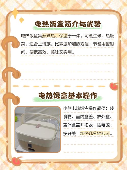 〖Three〗、电热饭盒并不能煮饭,只能加热饭菜,因此无法给出电热饭盒煮饭所需的时间。以下是对电热饭盒功能及加热饭菜所需时间的详细说明:电热饭盒的主要功能 电热饭盒是一种生活小家电,其主要功能是通过发热体通电后,使饭盒内部产生高温蒸汽,从而达到加热和保温饭菜的目的。