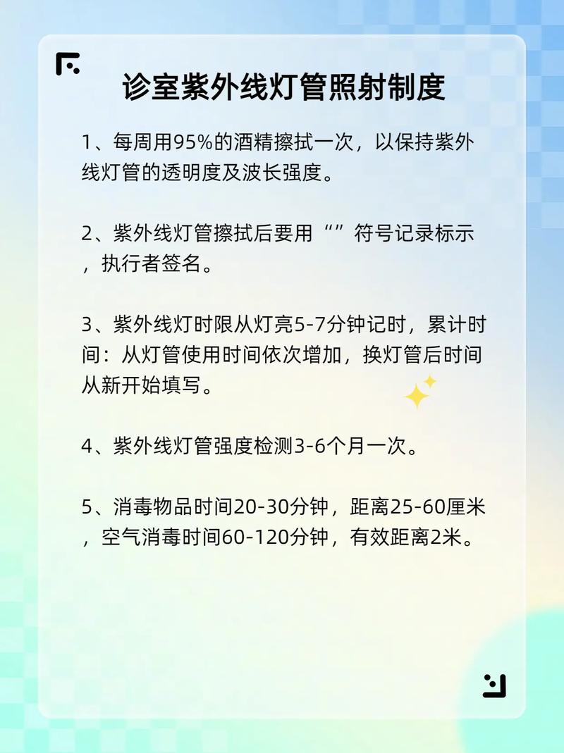 紫外线灯在采用间接照射法时,建议使用高强度紫外线空气消毒器,并开启设备消毒约30分钟。 若使用直接照射法,应确保每立方米空间配备不少于5W的紫外线灯,并照射不少于30分钟。 紫外线灯消毒的时间取决于使用方式。间接照射法通常需30分钟,而直接照射法要根据灯的功率和空间大小调整时间。