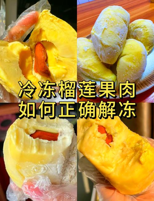 〖Four〗、常温解冻。将冷冻榴莲放在室温下解冻,大约需要10到30分钟,解冻后的榴莲果肉会变得柔软,可以直接食用,类似冰淇淋的口感。微波炉加热。将榴莲放入微波炉,中火加热约5到8分钟,即可食用。烤箱烤制。