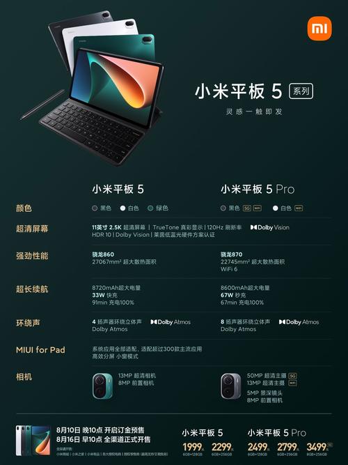 〖Two〗、年8月10日,小米平板5正式发布。2021年8月16日,小米平板5正式发售。2022年4月25日,小米平板58GB+256GB版本公布。2022年4月26日,小米平板58GB+256GB版本正式开售。2022年9月27日,小米平板58GB+128GB早上10点正式开售。