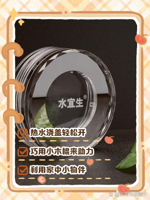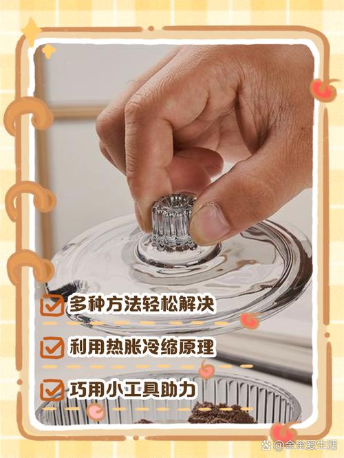 〖One〗、使用勺子:- 取一把薄而不锈钢的勺子,轻轻撬起玻璃杯盖的边缘。- 在撬动周围部分后,空气会进入杯内,释放压力后,杯盖即可轻松拧开。- 注意使用结实的勺子,以免损坏勺子。 利用热水:- 将玻璃杯口朝下放在平坦的盘子上,然后倒入少量热水。- 让杯口在热水中浸泡约30秒后,取出杯子。