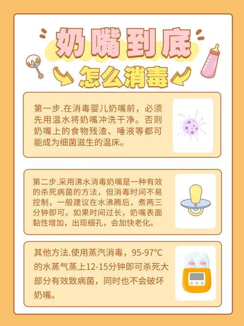 煮的时间:塑胶制成的奶嘴不宜煮久,否则容易变质。因此,建议在水滚后再放入奶嘴,按照上述时间进行煮沸消毒。注意事项:在煮沸消毒前,应确保奶嘴已经过清洗。同时,不锈钢煮锅应专为消毒奶瓶和奶嘴使用,避免与家中其他烹调食物混用。消毒完成后,应用消毒过的奶瓶夹取出奶嘴、瓶盖等,待其干燥后再使用。