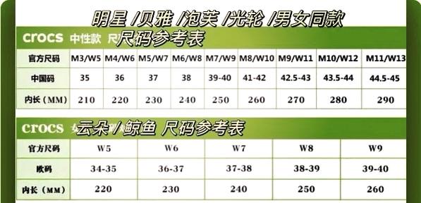 〖Two〗、购买洞洞鞋时,一般建议选取比平时穿的鞋子大半码到一码的尺码,但也要结合具体需求来决定。如果选大码,洞洞鞋通常材质较软,大一点的尺码穿着不会有紧绷感,能让脚趾自由活动,适合长时间行走或脚部容易肿胀的人,而且还可以搭配厚袜子。