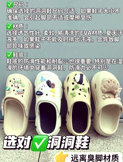 如果你平时穿38码的鞋子,那么在选取洞洞鞋时,可能需要尝试比平时大一码的鞋子,即39码或40码。这一建议并非绝对,因为不同品牌和款式的洞洞鞋在尺码上可能存在差异。 考虑个人脚型 你的脚型也是选取洞洞鞋尺码的重要因素。如果你的脚比较宽或者脚背较高,可能需要选取更大的尺码以确保舒适度和穿着体验。