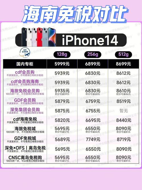 海南免税版iPhone14系列的售价范围是5689元至13089元,具体费用根据不同型号和存储容量有所不同。 海南免税店是中国购买电子产品划算的地方之一,因为“琼版”iPhone享受免税政策,免除了进口关税和增值税,费用上有约11%的优势。