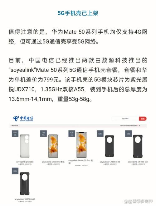 〖Three〗、但这一流程并不适用于华为Mate 50,因为其本身不支持5G网络。华为Mate 50的5G替代方案:虽然华为Mate 50本身不支持5G网络,但市场上有一些第三方厂商推出了5G手机壳,这种手机壳可以为不支持5G的手机提供5G网络连接功能。然而,这种方案并非华为官方提供,且可能涉及额外的费用和兼容性问题。