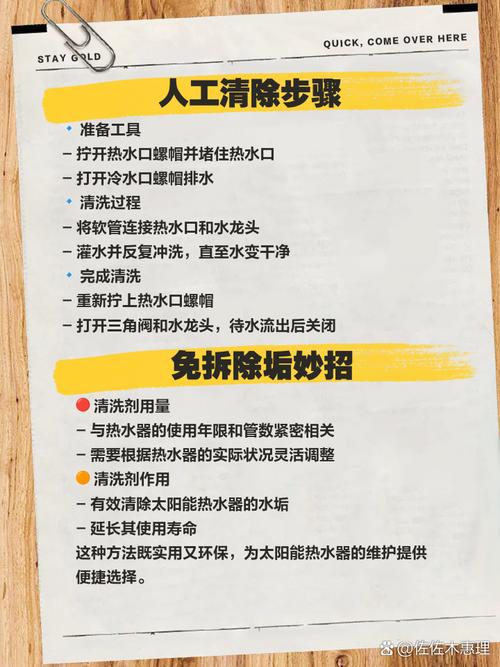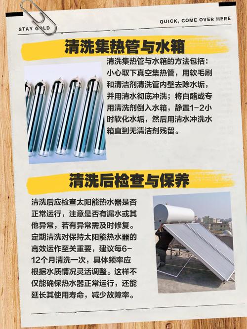 排空水箱:打开热水器的排水阀,将水箱内的水排空。3 清理水箱:使用专业的清洁剂或者醋溶液,按照产品说明书的指导进行清洁。注意避免使用腐蚀性强的清洁剂,以免损坏热水器。4 清洗集热器:集热器是太阳能热水器的核心部件,需要定期清洗以去除水垢和灰尘。