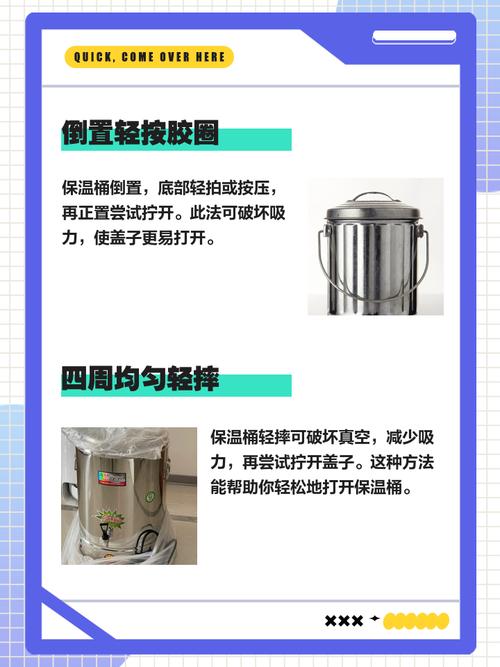 〖One〗、通气法:当保温桶打不开时,首先可以尝试给桶里通气。将保温桶倾斜或侧放,轻轻拍打桶盖或者底部,以便空气进入桶内,从而使内外压力平衡,达到打开的目的。 加热法:可以给保温桶加热,使桶内的空气受热膨胀,增加内部压力。可以将保温桶放在热水中浸泡一会儿,或者对桶盖部分进行热毛巾热敷,然后尝试打开。