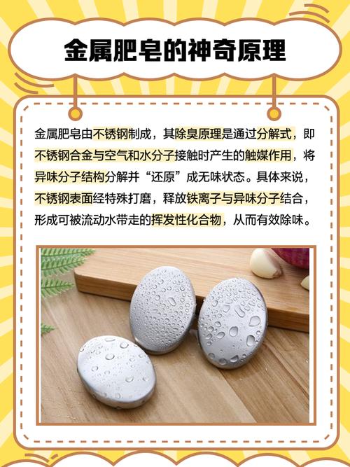 〖Three〗、钢铁肥皂除臭的原理主要是分解。具体来说:催化分解:当不锈钢合金同时与空气和水分子接触时,会产生催化作用,将气味分子结构分解,“还原”成无味状态。铁离子结合:不锈钢材质经过特殊抛光的磨砂表面与物体摩擦时,会释放铁离子,这些铁离子与异味分子结合,从而达到去除异味的效果。