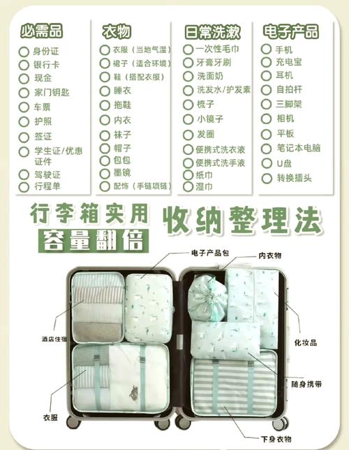行李箱空间利用:利用打底裤、袜子等不怕皱的物品填充行李箱凹槽处,然后放入衣物边边角角。另一边放入总结好的各种收纳袋、化妆包、鞋子等。清单核对:列出一个清单,完成行李总结后逐条核对,确保没有遗漏任何物品。额外背包准备:准备一个背包,里面放充电宝、电脑等带电池的产品,以及存放重要资料的文件袋,避免频繁开关行李箱。