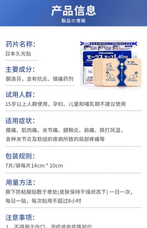〖Four〗、若近期有下架情况,可能是由于新型冠状病毒疫情导致的进出口贸易影响。 在久光贴暂时 unavailable 时,可以考虑使用其他产品以缓解症状。 日本久光贴的主要成分包括联苯乙酸、壬酸香草酰胺、维生素E等,具有优秀的局部刺激效果。 这些成分能够促进血液循环,缓解肌肉酸痛和胀痛感。